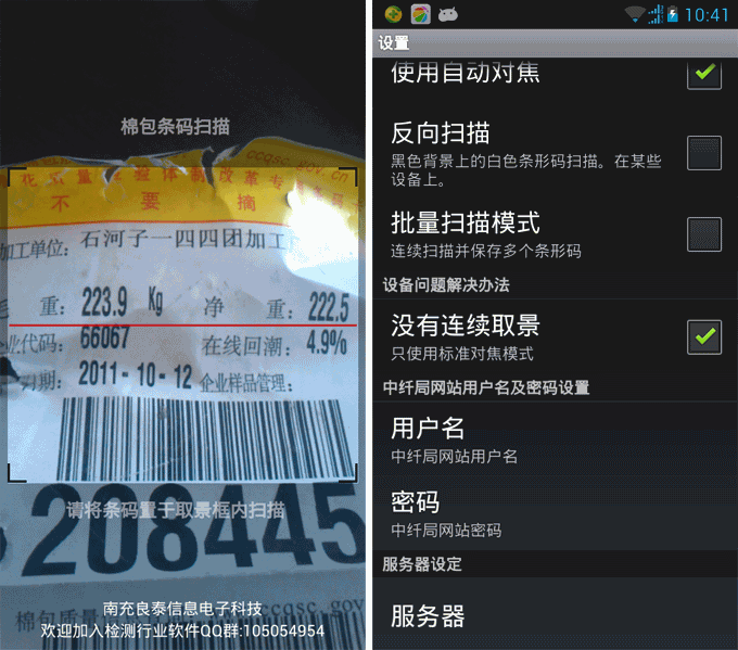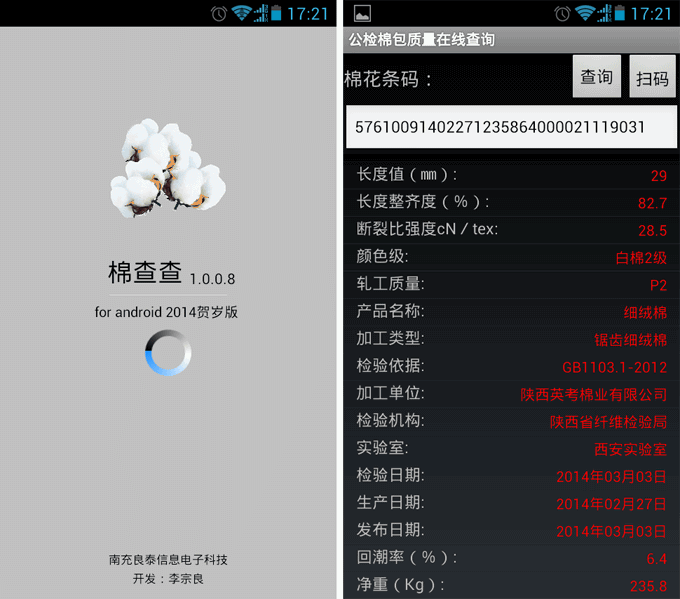 本软件的基本原理是利用手机的摄像头读棉包条形码,从中国纤维检验局的 中国棉花公证检验网站查询质量信息,由于中纤局并没有给我司查询接口,只有从查询到的网页中读取质量信息,简而言之这个软件就是摸拟人工查询。目前是用本人在中纤局棉花信息网站申请的帐号,您要大量查询请自己申请帐号查询。 软件界面: ![]() ![]() (责任编辑:良泰科技) |